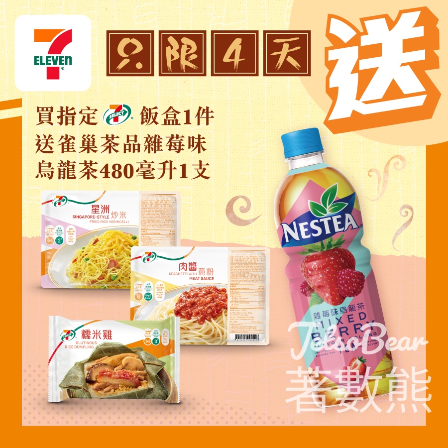 “【#買嘢食送嘢飲】 買指定 7-SELECT 飯盒一件 送雀巢茶品雜莓味烏龍茶480毫升一支 #只限4天