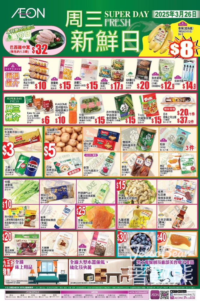 【AEON周三新鮮日 聽日就係喇】今個星期三 2025年3月26日,繼續精選多款TOPVALU產品 ,仲有精選 #新鮮蔬果、 #肉類海產、 #糧油雜貨、 #零食飲品,今次有TOPVALU提子乾(300克)及TOPVALU日本芝麻油(濃味)(150克)!