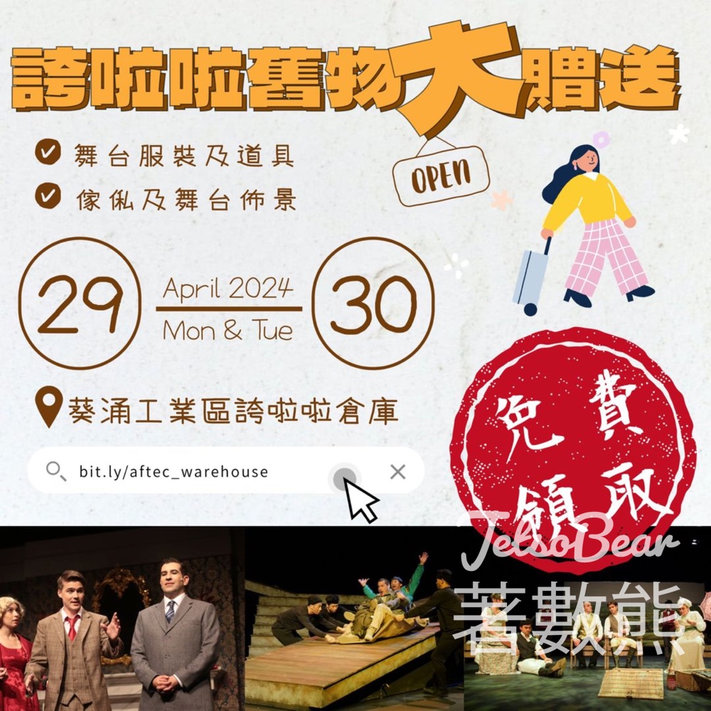 誇啦啦歡迎各大中小劇團,以及戲劇愛好者報名,讓這些舞台服裝及道具物盡其用。如欲參與,請填妥下方連結報名表或留言/私訊我們。