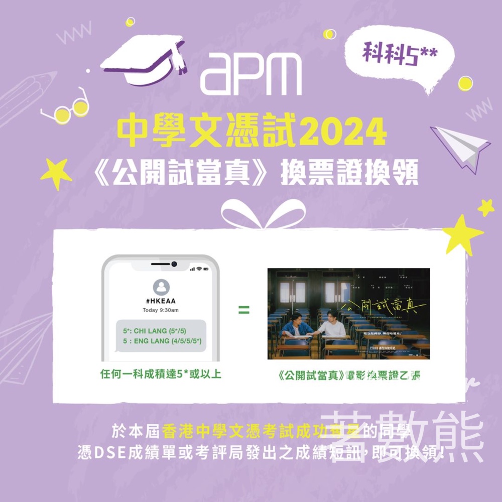 而為咗鼓勵大家,喺今屆香港中學文憑考試成功奪星嘅同學仔 (任何一科成積達5*或以上) ,放榜後憑DSE成績單或考評局發出嘅成績短訊,就可以免費換領《公開試當真》電影換票證,回望返考前「有血有汗」嘅發奮歷程,相信大家睇完都會有深深嘅共鳴!係時候放低壓力,約埋班Friend行街﹑睇戲放鬆吓!亦都預祝各位 2024DSErs 心想事成~