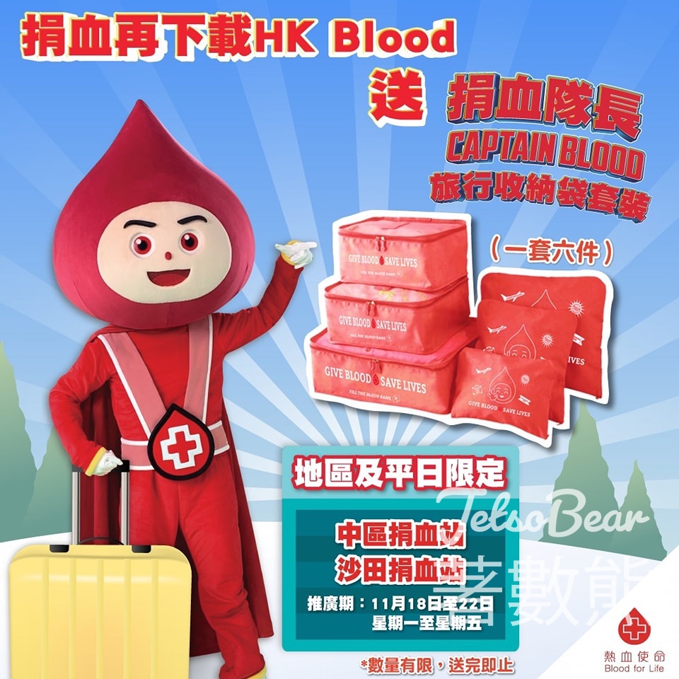 2024年11月18日至22日,於中區捐血站及沙田捐血站成功捐血及下載HK Blood App,即可獲贈「旅行收納袋套裝(一套六件)」。 紀念品數量有限,送完即止。