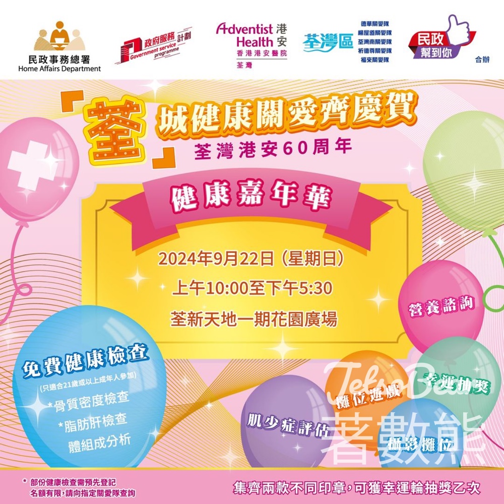 無論幾多歲,都應該時刻關注自己身體健康狀況 適逢今年荃灣港安60周年,荃新天地花園廣場將舉行荃城健康關愛齊慶賀 健康嘉年華到時大家可以做免費健康檢查,亦有攤位遊戲同幸運抽獎,記得唔好錯過呀