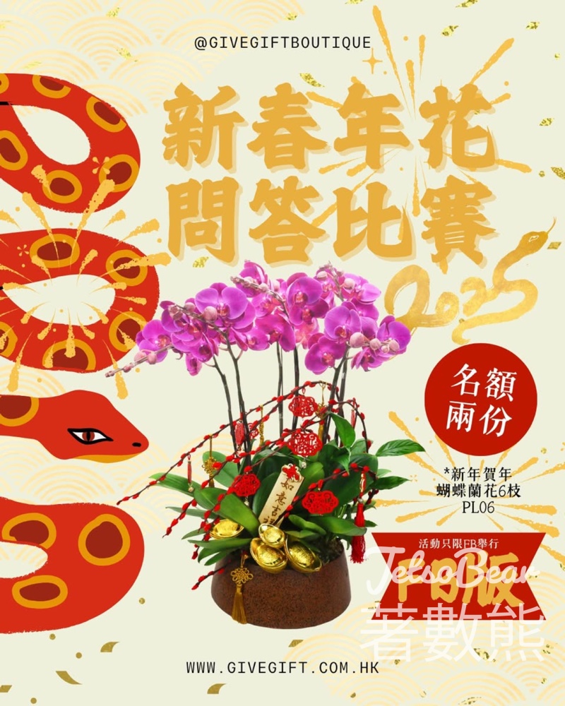 農曆新年就到,送禮究竟送禮籃好?定係送賀年年花好?好事成雙!Give Gift Boutique兩樣都送!Give Gift Boutique既IG及FB分別舉行左「新春禮籃問答比賽」及「新春年花問答比賽」,歡迎大家兩邊一齊參加增加得獎機會!Facebook 活動答中又被抽中的朋友將會得到「新年賀年蝴蝶蘭花6枝 PL06」名額:2份。參加方法非常簡單: