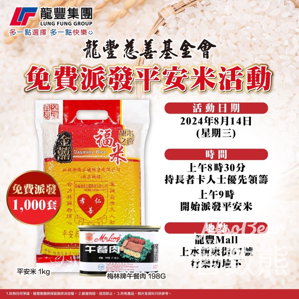 龍豐慈善基金會將於8月14日舉辦派發平安米活動,於上水行樂坊分店免費派發平安米(每包1公斤)及梅林牌午餐肉(198克)各1000件,各位街坊老友記如果有興趣拎返個好意頭嘅,就留意以下活動時間喇 希望大家身體健康、平平安安,攞返個好意頭