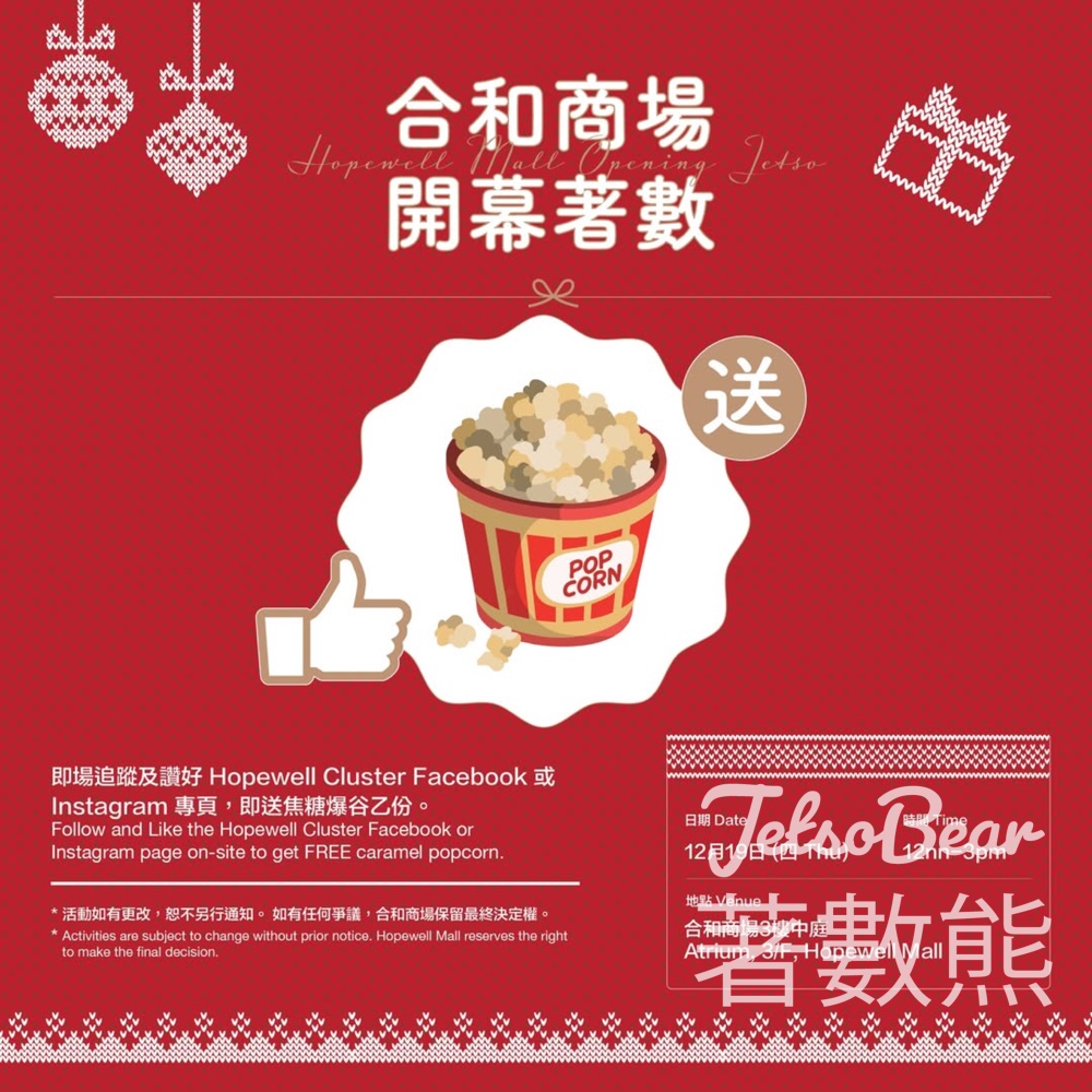 12月19日就是合和商場的開幕大日子!歡迎各位街坊朋友過來商場3樓中庭,共同參與《合和商場 X NITORI 開幕典禮》和《合和日本文化慶典》 現場只需追蹤及讚好Hopewell Cluster Facebook或Instagram專頁,即可獲贈一份焦糖爆谷,享受美味的同時感受精彩的慶祝氛圍,明天見!