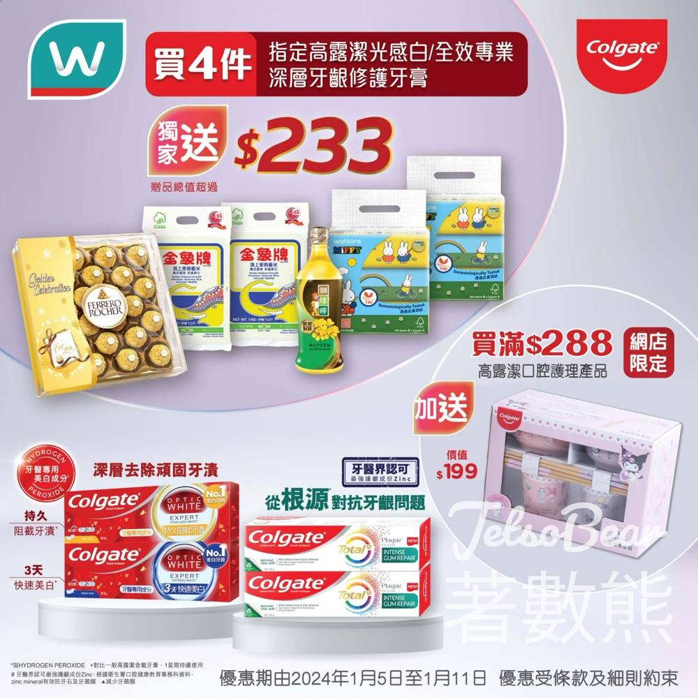 即日起至1月11日,去屈臣氏門市或網店購買高露潔全效專業深層牙齦修護牙膏或光感白系列牙膏85克4支即送以下總值超過$233豐富禮品︰