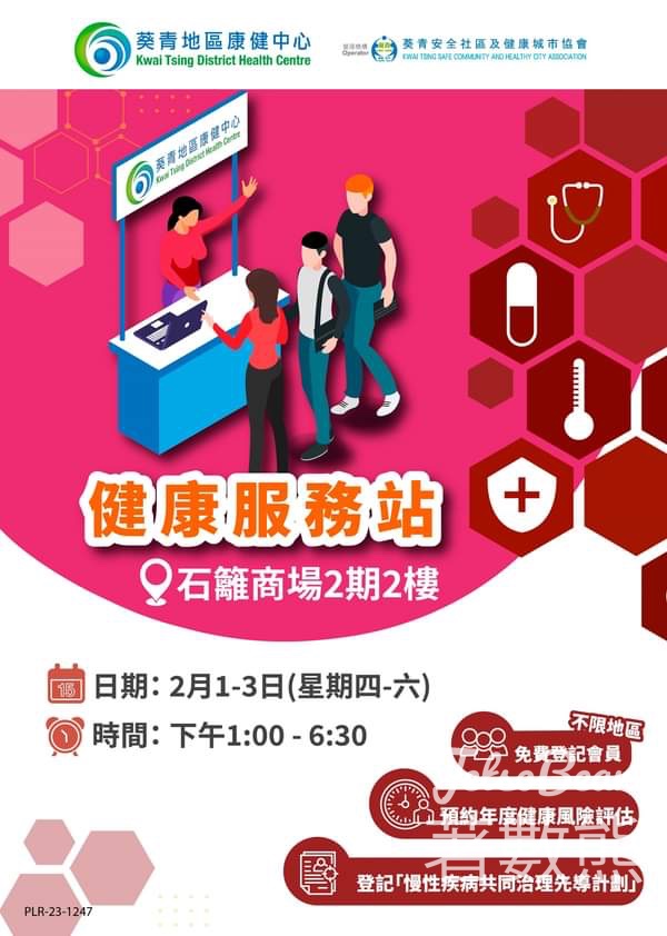 葵青地區康健中心由2月1日起一連三日將會到訪石籬商場,為各位街坊即場免費登記會員、預約年度健康風險評估、同埋登記「慢性疾病共同治理計劃」, 成功登記仲可獲精美禮品添約定你喇!