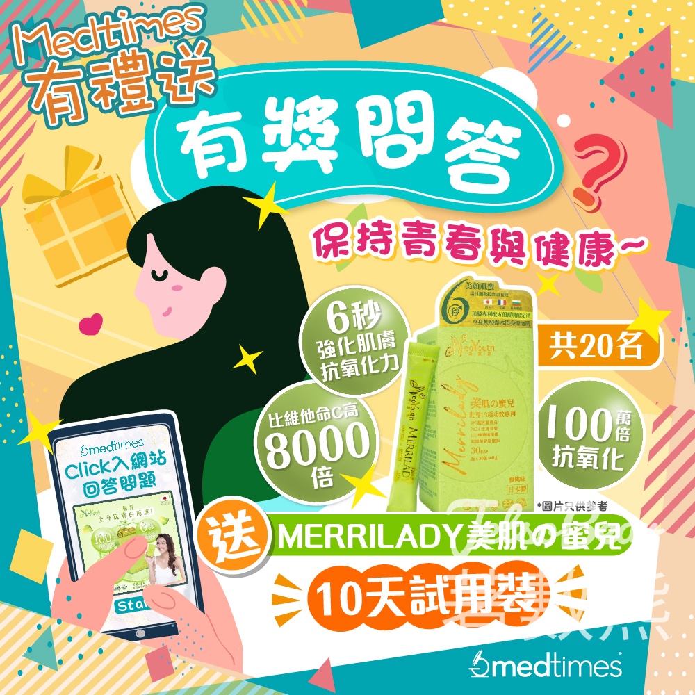 今次Medtimes NeoYouth 一齊考考你,睇下你對個人保養及身心健康了解有幾多,並送出 MERRILADY 美肌蜜兒 10天試用裝(價值:$232) 等大家試下呢款助你水潤、亮白、抗炎及抗氧化於一身嘅口服美肌補充劑~