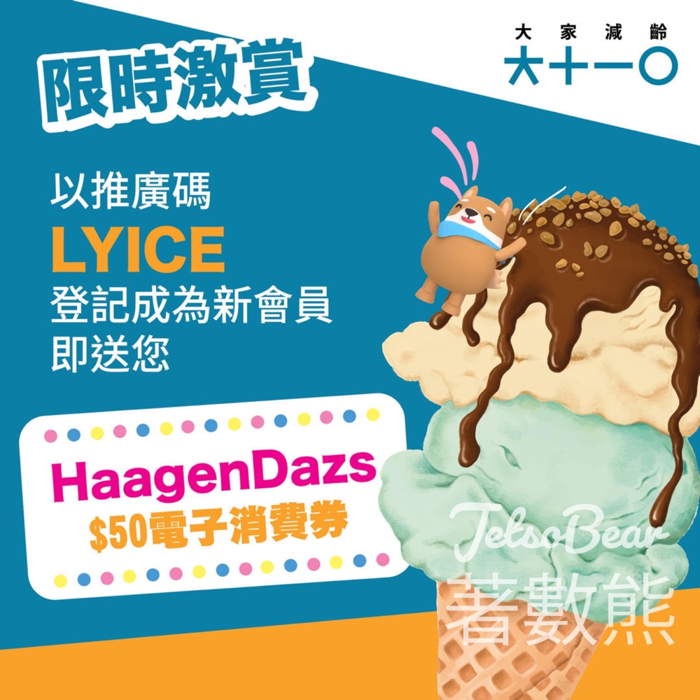 而家只要以推廣碼「LYICE」成功登記成為「大家減齡」獎賞計劃合資格新會員(基本或高級會員皆可)^,即可獲HaagenDazs港幣50元電子消費券一張*。數量有限,送完即止。