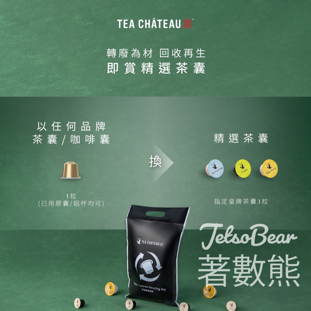 [轉廢為材 回收再生即賞精選茶囊] 即日起至2024年6月30日,攜帶任何品牌茶囊/咖啡囊到 TEA CHÂTEAU 任何門市並登記成為新會員,即可免費換取精選茶囊3粒。先試後買,因為TEA CHÂTEAU希望確保您將來購買嘅茶囊,可以啱哂自己口味!同時,希望大家到店換新茶囊時都可以自攜環保袋,令TEA CHÂTEAU可以攜手進一步減廢。提提大家,於任何一間 TEA CHÂTEAU 門市購買茶囊,均可參加茶囊回收計劃,轉廢為材,回收再生。