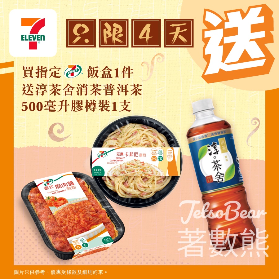 【7-Eleven 買嘢食送嘢飲】買指定 7-SELECT 飯盒一件,送淳茶舍消茶普洱茶500毫升膠樽裝1支 #只限4天