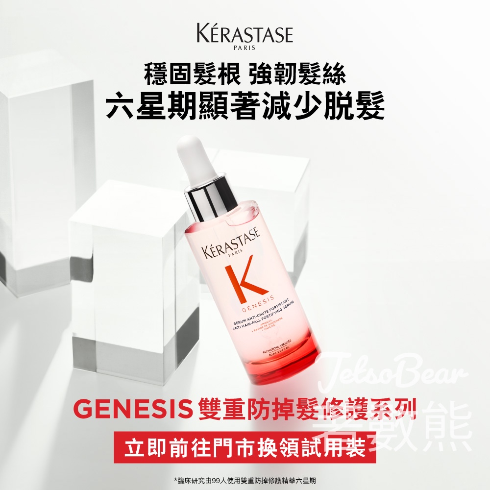 【6週減少84%脫髮問題⁴ | KÉRASTASE送你人氣GENESIS雙重防掉髮修護系列試用套裝 】KÉRASTASE皇牌 #GENESIS雙重防掉髮修護精華 蘊含1.5%亞美尼斯¹、生薑萃取物、咖啡因及雪絨花幹細胞等高效護膚活性成分,細緻呵護頭皮同時增強頭髮附著力, 6星期減少84%掉髮⁴ ,舒緩頭皮及減少痕癢² 。質地輕盈不油膩,瞬速滲透頭皮肌膚,從根源鞏固髮絲。