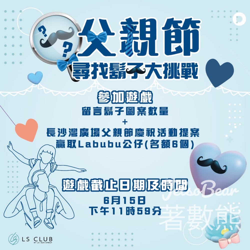 【長沙灣廣場父親節大挑戰|尋找鬍子贏Labubu公仔】今個父親節,長沙灣廣場一樓玻璃上貼滿超可愛嘅裝飾貼紙,考考你眼力——數數有幾多個「鬍子」圖案藏喺裝飾貼紙入面?一齊嚟參加遊戲贏取Labubu公仔!