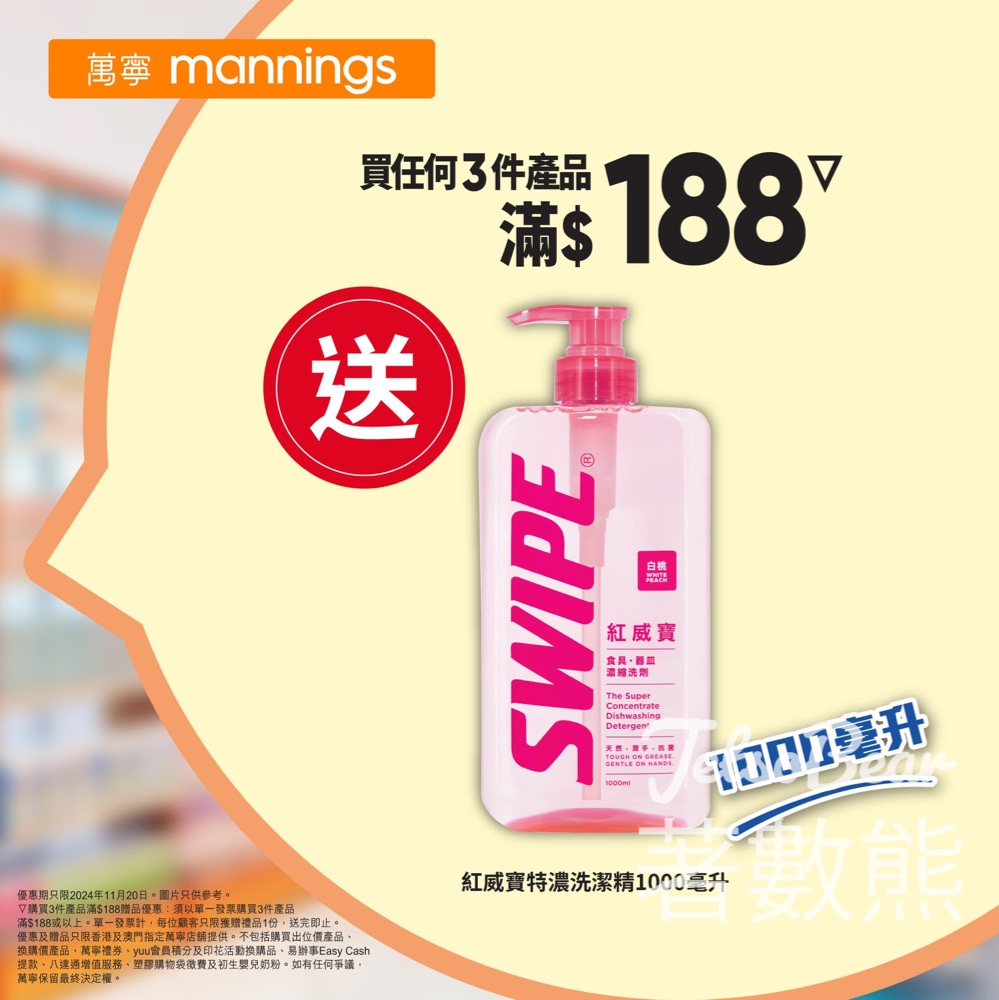 買任何3件產品滿$188,即送紅威寶濃縮洗劑1000毫升一支!