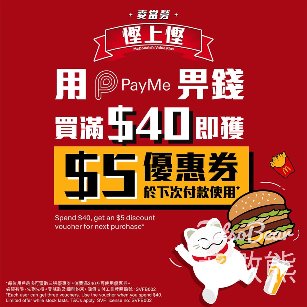 【麥當勞慳上慳:買滿$40自動獲得PayMe $5優惠券 】