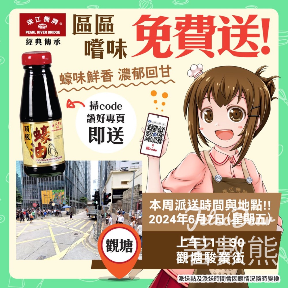 很快又一星期啦各位,又來公佈下一次區區嚐味【珠江橋牌頂級蠔油】免費派送活動的位置啦,明天將會來到 #觀塘駿業街~!應該不會下雨了吧…?