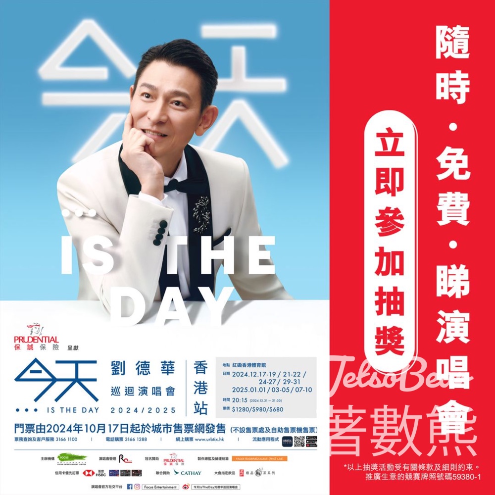 保誠保險呈獻《今天 … is the Day劉德華巡迴演唱會2024/2025》香港站撲唔到飛?小編有驚喜~ 畀.到.你!即時參加抽獎,有機會贏走HK$980門票2張(總值HK$1,960)(名額:5名) ( www.prudential.com.hk/…/andylau-concert-lucky…/ )