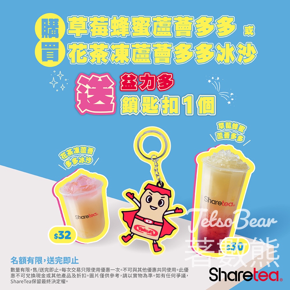 依家嚟Sharetea門店購買其中一杯*,即送”益力多公仔”鎖匙扣1個,送完即止!快啲嚟買返杯嘆下啦!