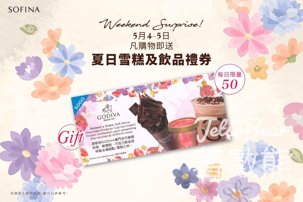 Weekend Surprise! 一連兩個週末,SOFINA 將於崇光專櫃與大家分享感謝祭嘅熱鬧同喜悅!今個週末5月3至4日親臨SOFINA 專櫃購物,即免費送你GODIVA 崇光店限定夏日軟雪糕及飲品禮券一張*,每日限定50份!孖住閨蜜一齊Shopping 再品嚐精緻甜點,感受於忙碌生活中療癒身心的幸福儀式感!