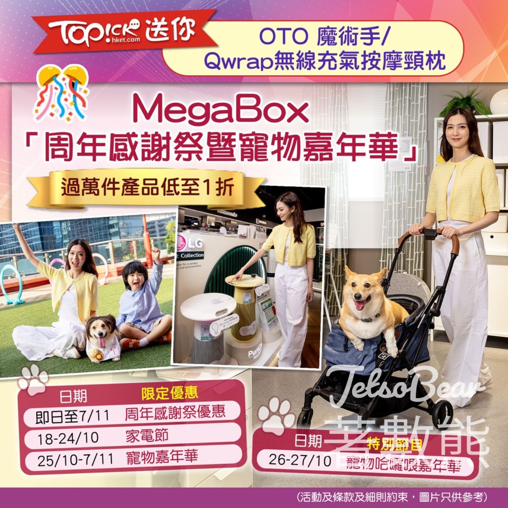 MegaBox 年度盛事「周年感謝祭暨寵物嘉年華」由即日起至11月7日舉行!推出近300個獨家優惠,過萬件產品低至1折!期間仲舉辦MegaBox周年大抽獎,獎品總值超過20萬元,有限量版周年福袋換領活動。另外有每周最高消費賞,連續六周梳化電器賞不停,送出近20萬元家品梳化電器。