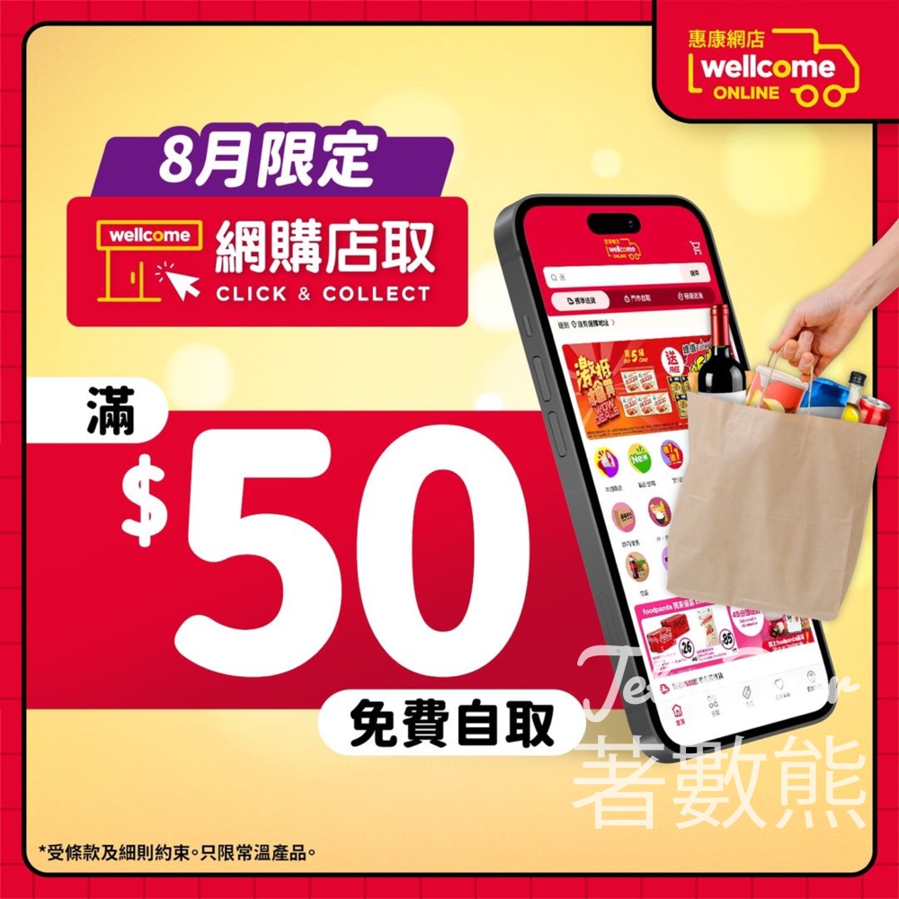 惠康 8月限定買滿$50免費門市自取 Jetso Bear更新時間:2024-08-272024-08-27 【惠康8月限定買滿$50免費門市自取】即日起買滿$50可免費網購店取!隨時隨地開APP落單自由選擇任何一間 惠康 / Market Place / 3hreesixty 分店憑短訊取貨。方便又彈性!即開惠康網店APP,把握八月限定網購店取優惠優惠期:1/8-31/8/2024*受條款及細則約束。只限常溫產品。按此進入詳情 >圖片及資料來源:惠康超級市場 Wellcome Supermarket惠康 8月限定買滿$50免費門市自取 was last modified: August 27th, 2024 by Jetso BearJetso BearCreated: 2024-08-17